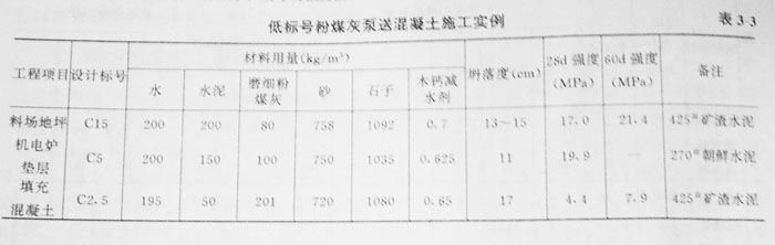 可泵性主要決定于混凝土與管壁之間的摩擦力。由于低標(biāo)號混凝土的水泥用量少,可泵性差,因此,過去規(guī)定C15以下的混凝土不得泵送。可是摻如粉煤灰和減水機(jī)劑后,可使混凝土在不增加水泥的情況下仍能獲得良好的可泵性。在寶電工程中,C2.5、C5和C15的混凝土在300m水平硬管輸送時(shí)也沒有發(fā)生堵塞現(xiàn)在。表3—3是低標(biāo)號粉煤灰泵送混凝土的施工實(shí)例。